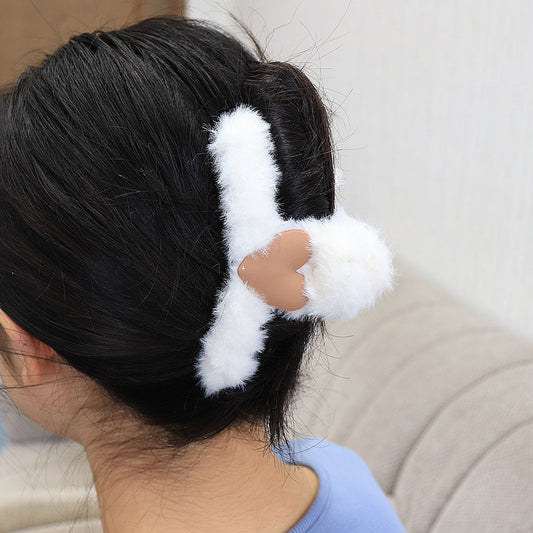ホワイト/ハート付きふわふわファーバンスクリップ