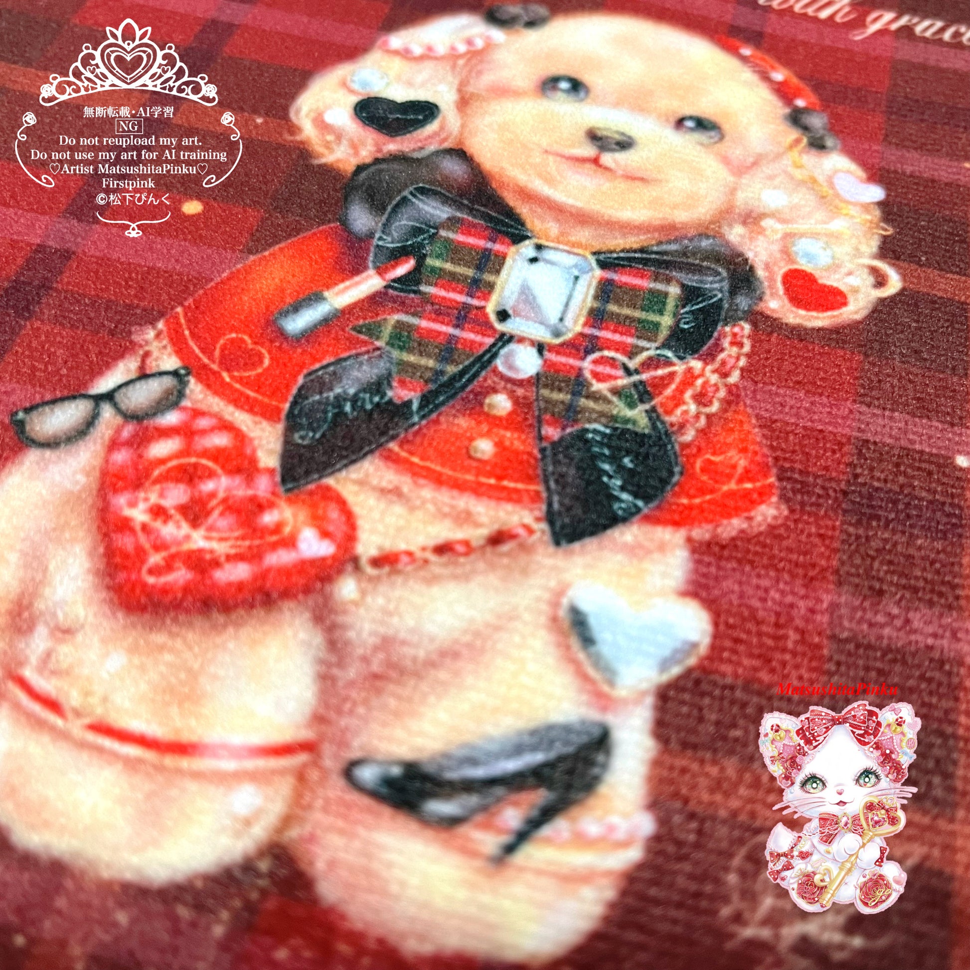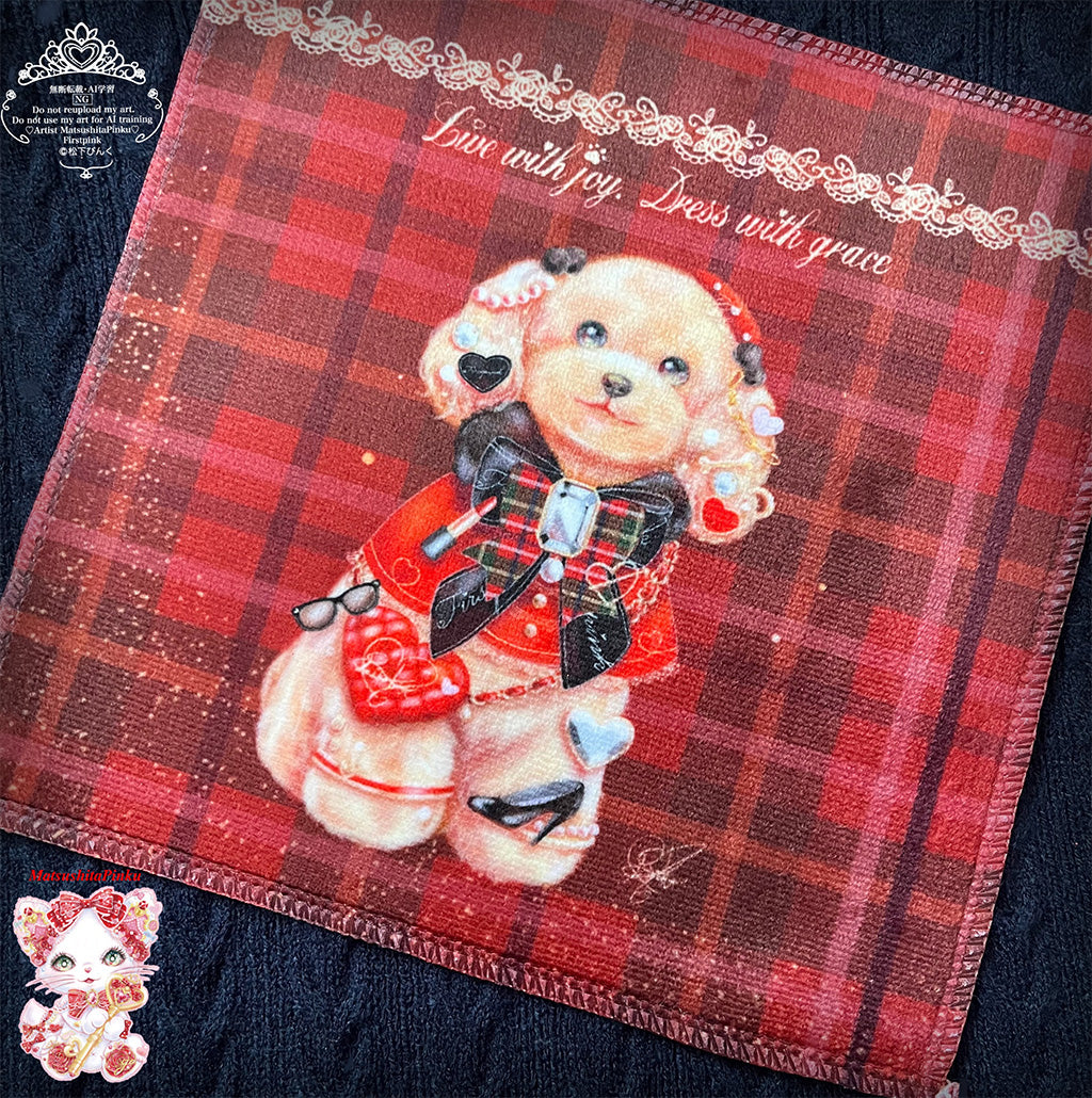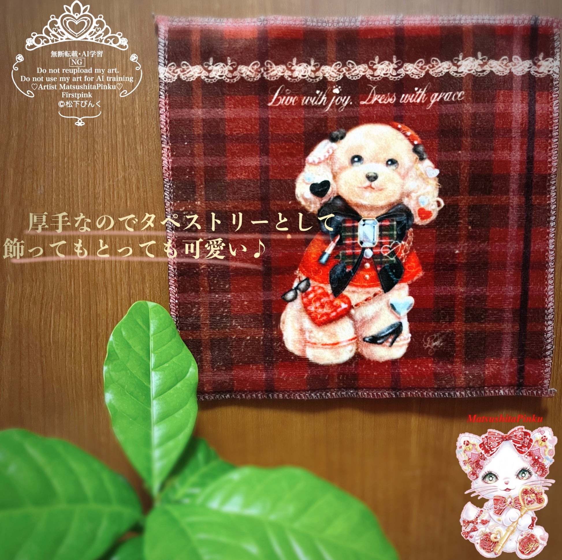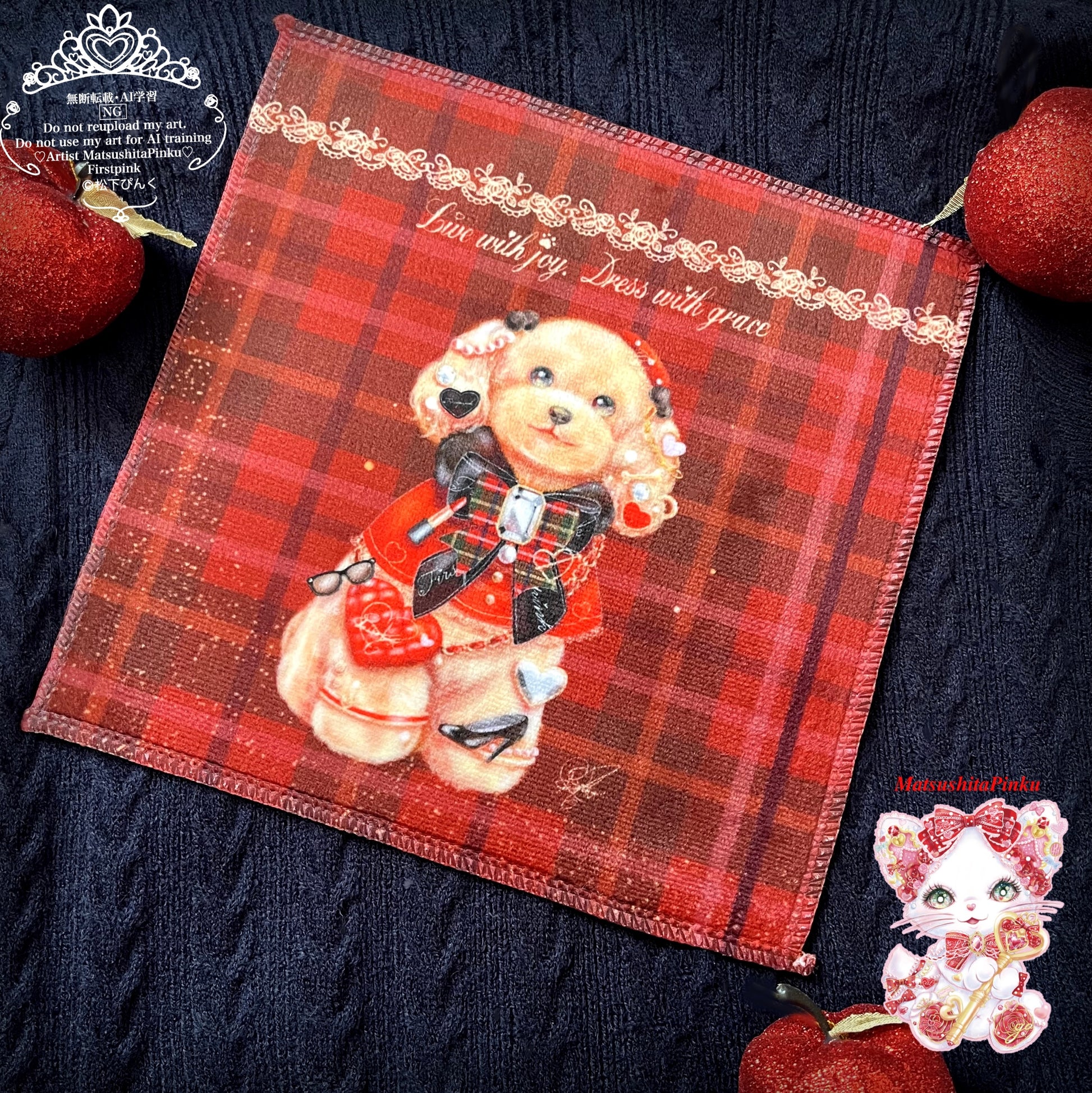 おしゃれして待ち合わせしているウキウキわんちゃんが可愛い♪表面はマイクロファイバー。裏は吸水性の良い綿のハンカチタオル。"Live with joy. Dress with grace."(喜びとともに生きて。優雅に装って。)と描かれており、人生をおしゃれして毎日を楽しく過ごすがイラストコンセプト。前向きで気分が華やぐモチーフのハンカチは、自分用はもちろん、ギフトにもおすすめ!また壁に飾ってミニタペストリーとしてもお使いいただけます。