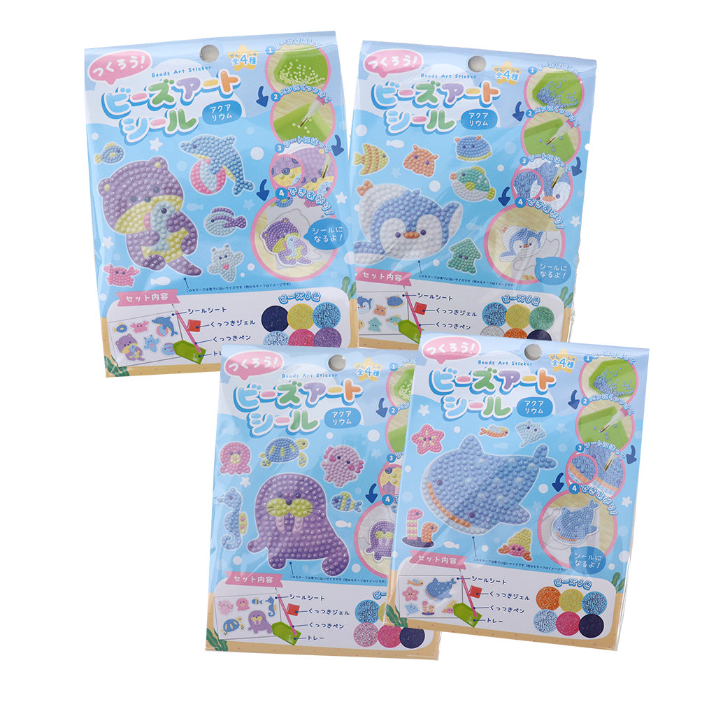 人気のビーズアートシールです。 付属のシールシートにビーズを貼り付けてビーズシールが作れる子供向けDIYシールキット 150×100mmのシールシートには大小色々な海の生き物モチーフが描かれています。 ビーズを指定の場所に貼り付けていくとビーズシールが出来上がります。