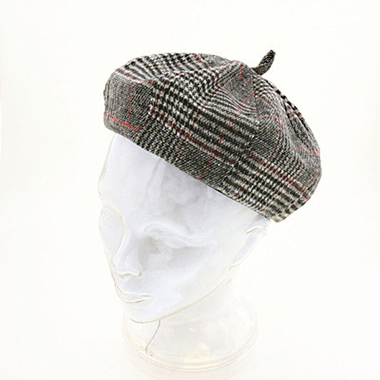 ブラウン系/赤ライン入りチェック柄ベレー帽