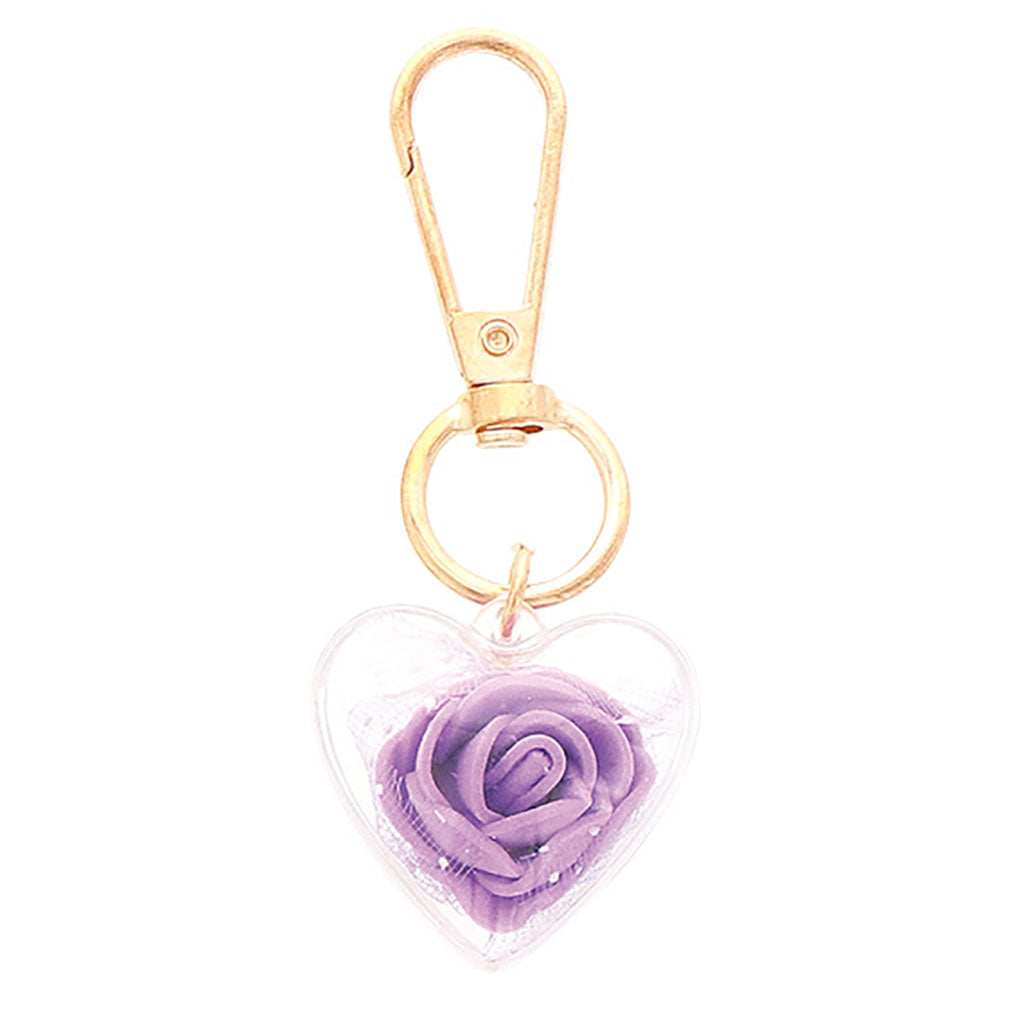 紫/バラ入りクリアハートキーホルダー